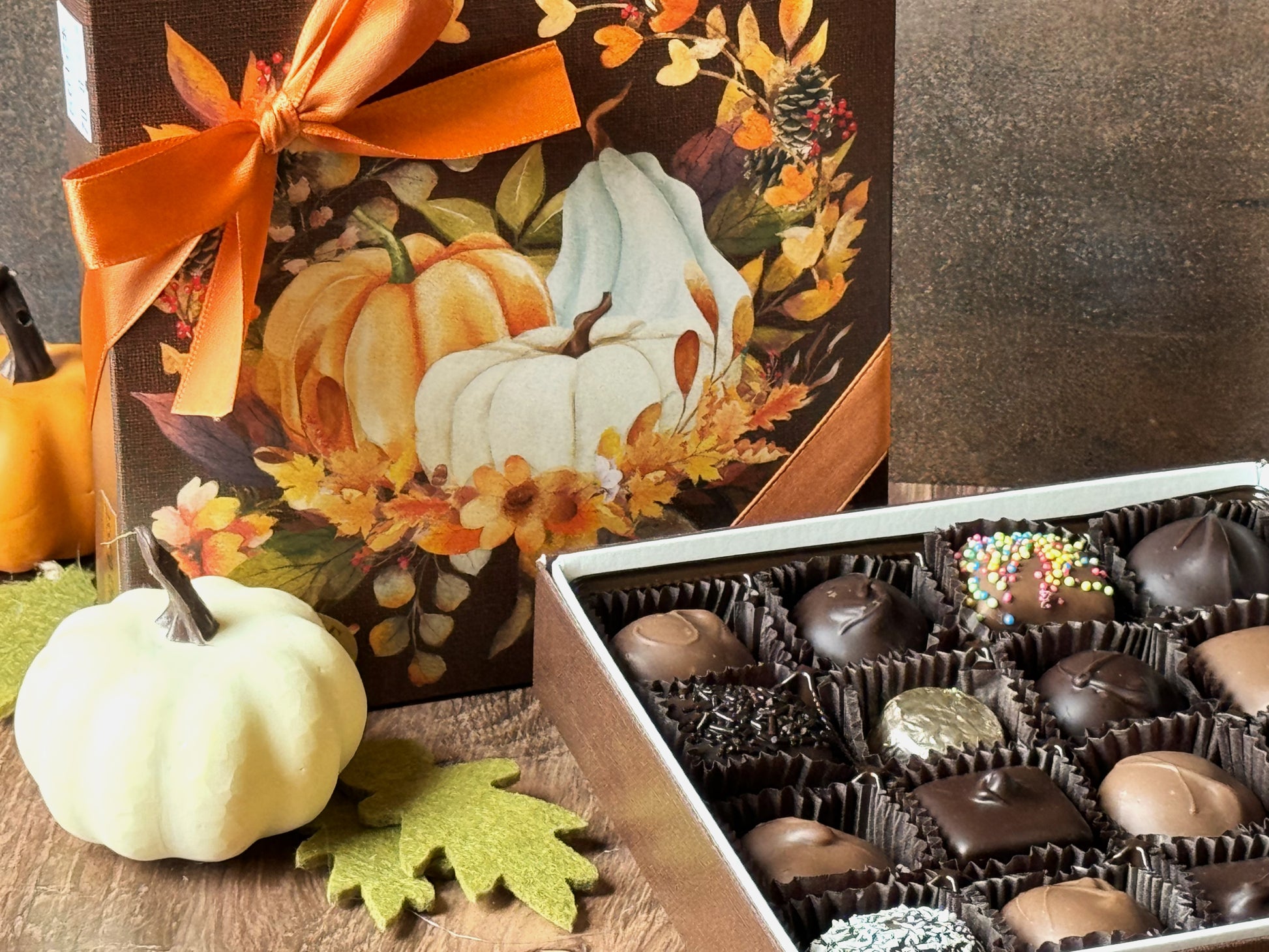 Our tasty traditional assortment of milk and dark chocolate nuts, chews, and creams. All wrapped up in a gourd-geous box just like it says. This box makes a great treat for your host at any autumn gathering.