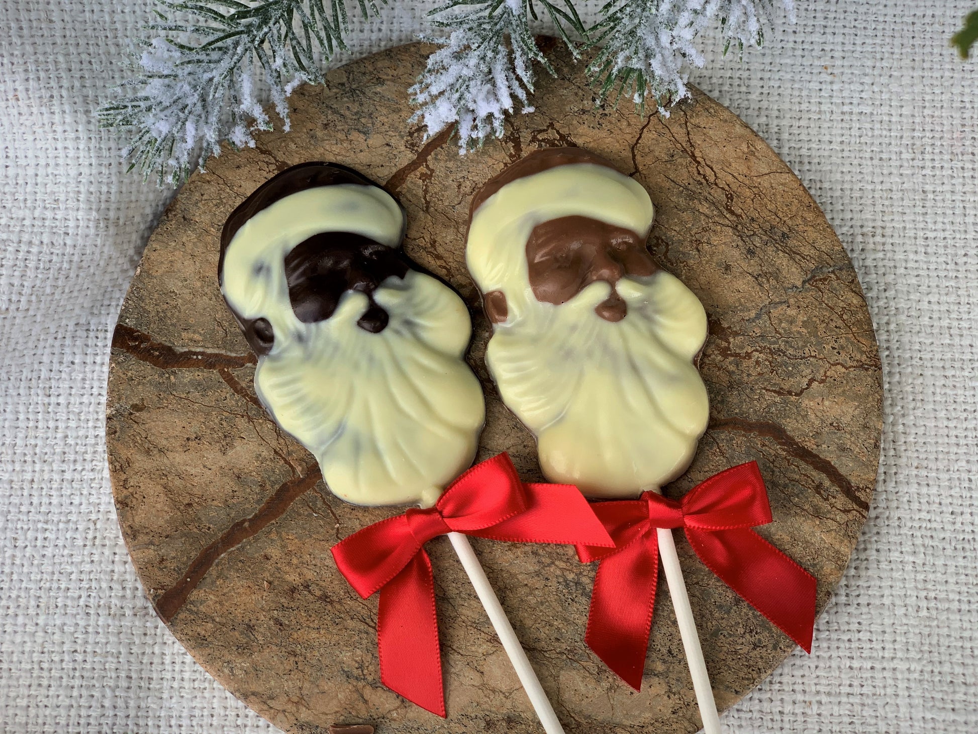 HO! HO! HO! Say Merry Christmas with this Solid Chocolate Santa face pop. Measuring approximately 4 inches tall and 2.5 inches wide, this Santa face has a white chocolate hand painted beard and fur on his hat. A perfect stocking stuffer for a chocolate lover or just a great sweet treat on a stick that is conveniently neat to eat.